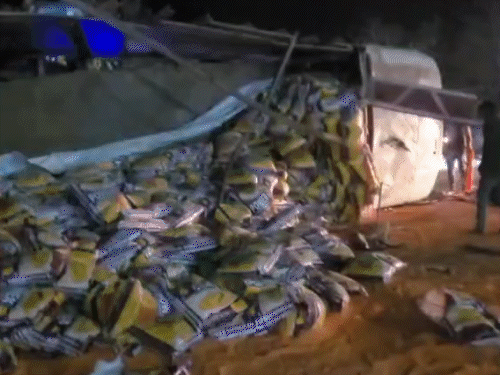 कोडरमा में 500 बोरा दाल उठा ले गए ग्रामीण:घाटी में दो ट्रकों की टक्कर के बाद सड़क पर बिखरी थी बोरियां, पुलिस कर रही तलाश