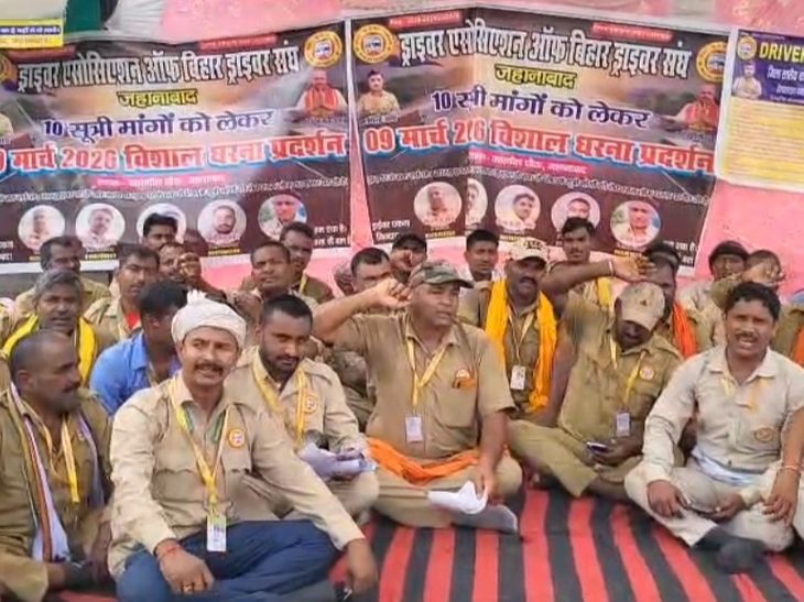 जहानाबाद में ड्राइवरों ने दिया धरना:10 मांगों को लेकर पैदल मार्च करते हुए कारगिल चौक पहुंचे