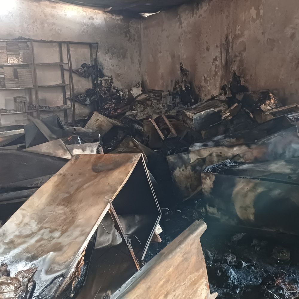 पलामू में इलेक्ट्रॉनिक गोदाम में भीषण आग:घंटे की मशक्कत के बाद काबू; लाखों का सामान राख, शॉर्ट सर्किट से उठीं लपटें