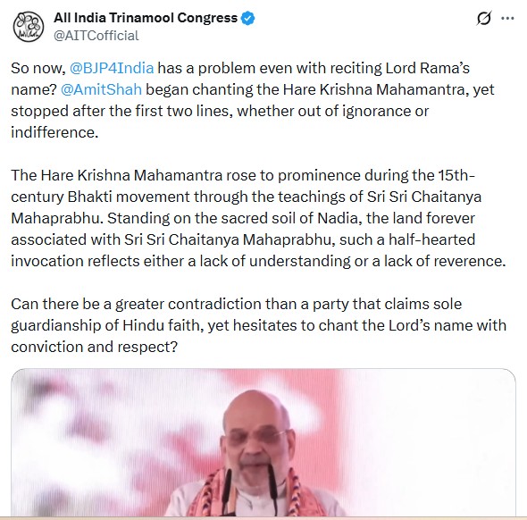 इसी वीडियो का एक हिस्सा काटकर तृणमूल कांग्रेस ने पोस्ट किया और लिखा- अब भारतीय जनता पार्टी (भाजपा) को भगवान राम का नाम लेने में भी दिक्कत हो रही है? टीएमसी ने आगे कहा- मायापुर में अमित शाह ने हरे कृष्ण महामंत्र का जप किया. शुरू की 2 लाइनों के बाद वह चुप हो गये. पार्टी ने पूछा कि ऐसा अज्ञानता में हुआ या उदासीनता की वजह से उन्होंने ऐसा किया?