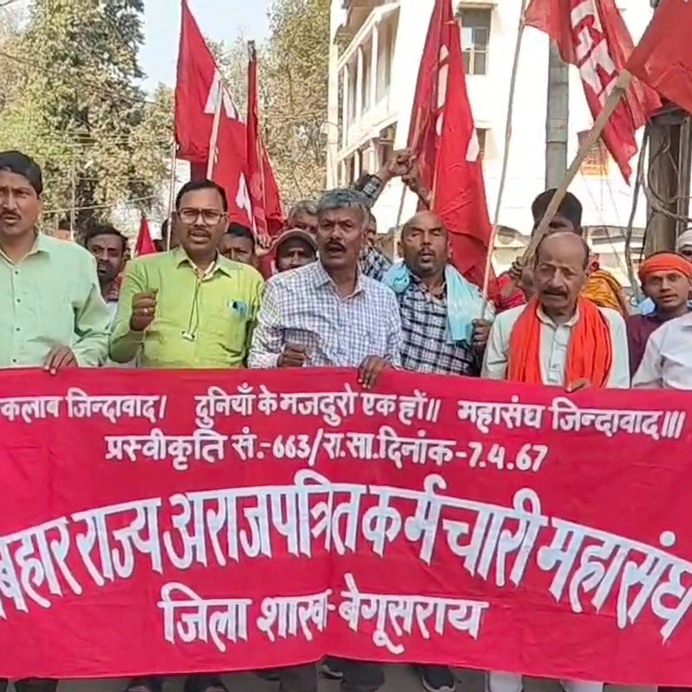 अखिल भारतीय कर्मचारी महासंघ के आह्वान पर सरकारी कर्मचारियों ने आज मांगों को लेकर बेगूसराय में प्रदर्शन किया। जिला मुख्यालय पर प्रदर्शन करते हुए कर्मचारियों ने केंद्र और राज्य सरकार के खिलाफ जमकर नारेबाजी की और डीएम को ज्ञापन सौंपा। प्रदर्शनकारियों ने कहा कि यदि सरकार उनकी मांगों पर जल्द विचार नहीं करेगी, तो हड़ताल पर जाएंगे। नेताओं ने कहा कि इस मांग दिवस के माध्यम से वे सरकार तक अपनी आवाज पहुंचाना चाहते हैं। NPS और UPS के नाम पर उनके सामाजिक सुरक्षा के साथ खिलवाड़ किया जा रहा है। सरकार जल्द से जल्द पुरानी पेंशन योजना लागू करें। जनवरी 2026 से लागू होने वाले 8वें वेतन आयोग की प्रक्रिया तेज की जाए। सरकार की ओर से गठित कमेटी को जल्द रिपोर्ट देने और तब तक 5 से 10 प्रतिशत अंतरिम राहत देने की मांग की गई है। चतुर्थ वर्गीय पदों को समाप्त करने और दैनिक वेतनभोगियों के शोषण का विरोध किया गया। मांग है कि सभी संविदा और दैनिक कर्मियों की सेवा को नियमित किया जाए। लाए गए 4 नए लेबर कोड को रद्द कर पुराना 44 श्रम कानून बहाल हो। पूरे देश में मांग दिवस मनाया जा रहा आज पूरे देश में मांग दिवस मनाया जा रहा है। सरकार ठेका, संविदा और मानदेय के नाम पर कर्मचारियों का शोषण कर रही है। चतुर्थ श्रेणी के पदों को खत्म कर दिया गया है। हम मांग करते हैं कि इन सभी कर्मियों की सेवा नियमित की जाए। उन्होंने आगे कहा कि 8वां वेतन आयोग लागू करने में हो रही देरी बर्दाश्त नहीं की जाएगी। सरकार ने कमेटी बनाकर इसे 18 महीने के लिए टाल दिया है, जो कर्मचारियों के हितों के खिलाफ है। बिहार सरकार ने सितंबर 2005 और केंद्र ने जनवरी 2004 से पुरानी पेंशन बंद कर दी थी। PFRDA बिल के माध्यम से जो नई व्यवस्था लाई गई है, वह कर्मचारियों के बुढ़ापे का सहारा छीनने जैसी है। आज का यह प्रदर्शन तो सिर्फ एक शुरुआत है। यदि सरकार ज्ञापन में दर्ज हमारी मांगों पर संज्ञान नहीं लेती है, तो राज्य और राष्ट्रीय स्तर पर बड़े आंदोलन की रूपरेखा तैयार की जाएगी। इस दौरान भारी संख्या में कर्मचारी संघ के सदस्य लाल झंडों और बैनरों के साथ समाहरणालय के नजदीक डटे रहे। इस दौरान कर्मचारियों ने मांगों के समर्थन में सरकार के खिलाफ जमकर नारेबाजी की।