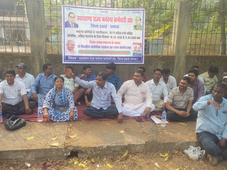 रामगढ़ में मनरेगा कर्मियों का दो दिवसीय धरना:सेवा नियमित करने और बकाया मानदेय की मांग