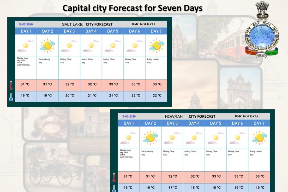 सॉल्टलेक और हावड़ा का उच्चतम तापमान इन 7 दिनों में 31 से 33 डिग्री सेंटीग्रेड रहने का अनुमान है. सॉल्टलेक का न्यूनतम तापमान 19 से 22 डिग्री सेंटीग्रेड रह सकता है. वहीं, हावड़ा शहर में न्यूनतम तापमान 16 डिग्री सेंटीग्रेड से 19 डिग्री सेंटीग्रेड के बीच रहने का अनुमान है.