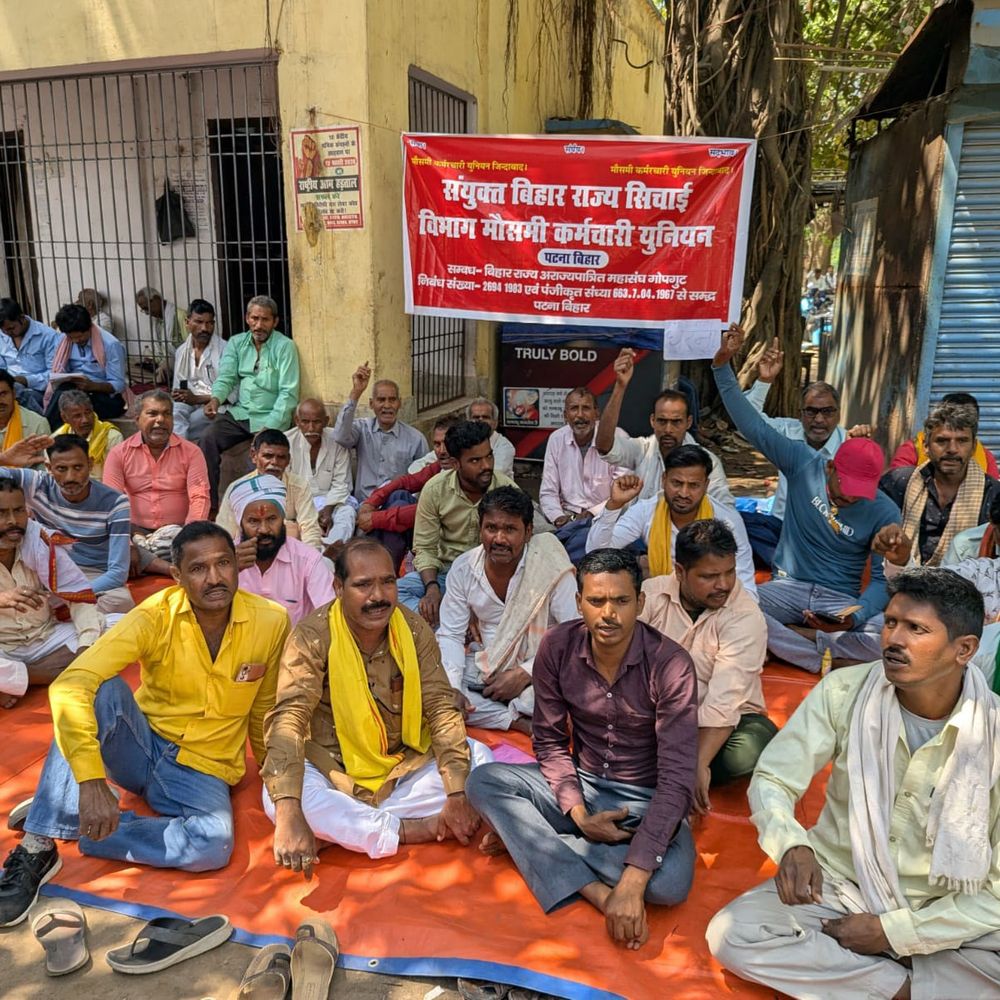 सिंचाई विभाग के मौसमी कर्मचारियों का अनिश्चितकालीन धरना:भोजपुर-रोहतास के 300 से अधिक कर्मचारियों ने सरकार के खिलाफ की नारेबाजी, एक ने कहा- कर्ज लेकर पत्नी का कराया ऑपरेशन