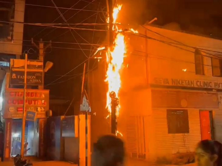 हजारीबाग के कुंआ चौक पर बिजली पोल में लगी आग:शॉर्ट सर्किट से आग लगने की संभावना, बिजली के तार पिघलकर नीचे गिरे