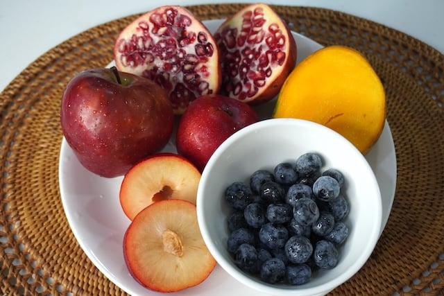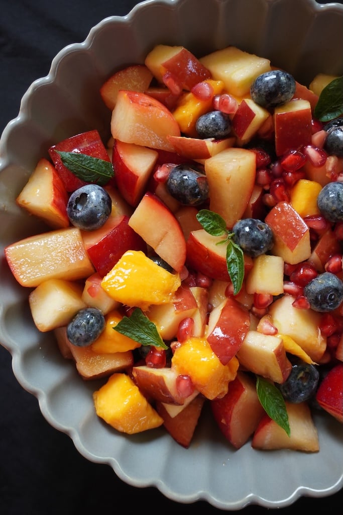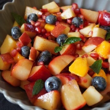 This fruit salad is our new obsession. Not only it is easy to make, but so tasty. I packed this salad with antioxidant rich fruits like blueberries, plums, pomegranates, mangoes and apples.
