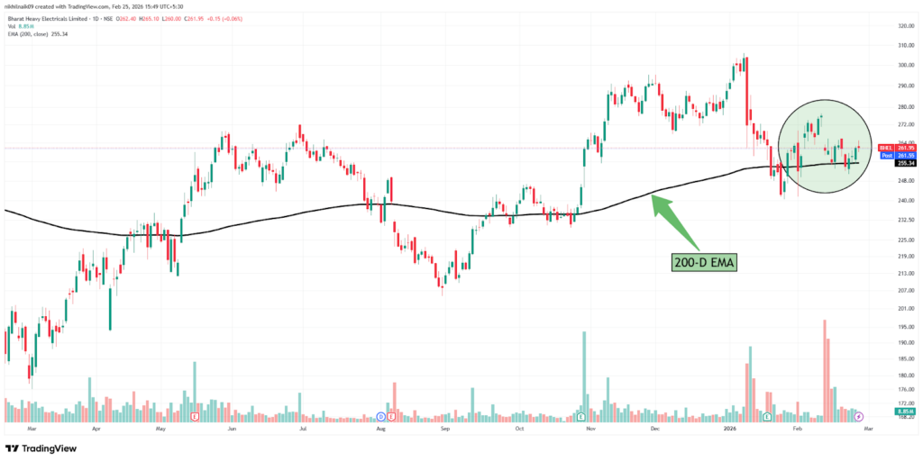 The 200-day Exponential Moving Average (200-D EMA) is a commonly used indicator to identify a stock’s long-term trend. It gives more weight to recent price movements, making it more responsive than a simple moving average. Investors and traders use it to determine whether a stock is in a sustained uptrend or showing signs of weakness.