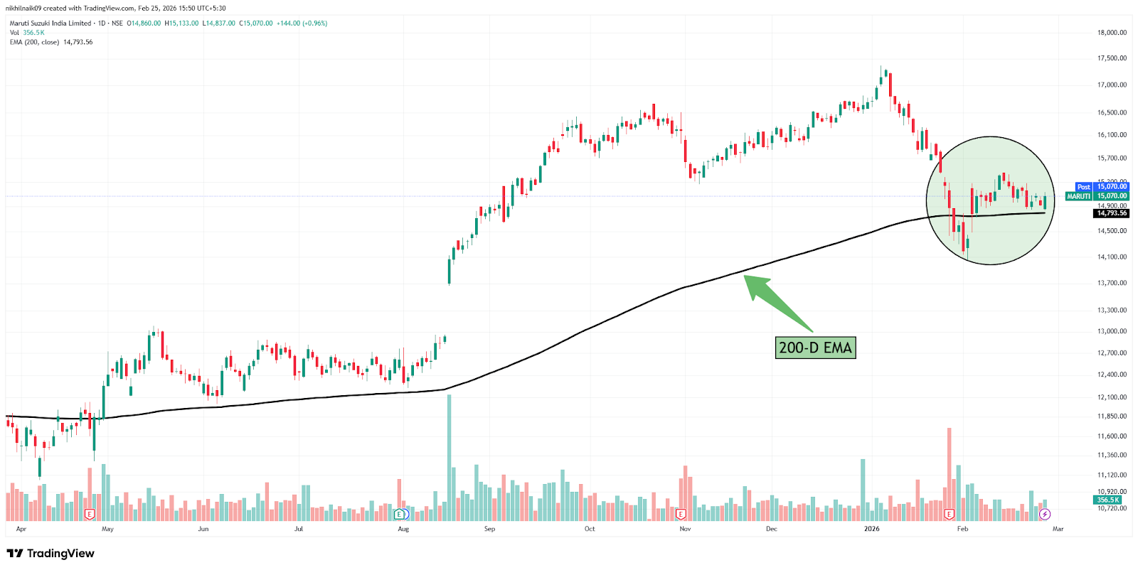 Maruti Suzuki India Limited is taking support of the 200-day exponential moving average (200-D EMA) at a price of approximately Rs. 14,793.56. The stock closed at Rs. 15,070 in Wednesday’s session, reflecting a 0.96 percent increase in the intraday trade.