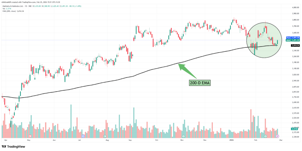 Mahindra & Mahindra Limited is taking support of the 200-day exponential moving average (200-D EMA) at a price of approximately Rs. 3,414.34. The stock closed at Rs. 3,491.30 in Wednesday’s session, reflecting a 1.69 percent increase in the intraday trade.