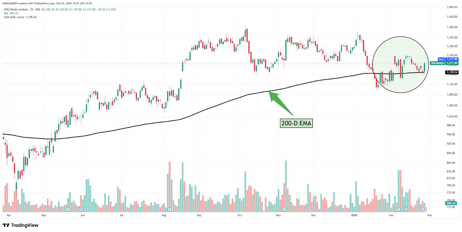Uno Minda Limited is taking support of the 200-day exponential moving average (200-D EMA) at a price of approximately Rs. 1,178.54. The stock closed at Rs. 1,217.80 in Wednesday’s session, reflecting a 3.42 percent increase in the intraday trade.