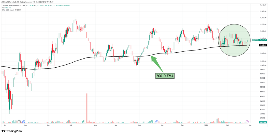 360 ONE WAM Limited is taking support of the 200-day exponential moving average (200-D EMA) at a price of approximately Rs. 1,102.51. The stock closed at Rs. 1,131.80 in Wednesday’s session, reflecting a 1.65 percent increase in the intraday trade.