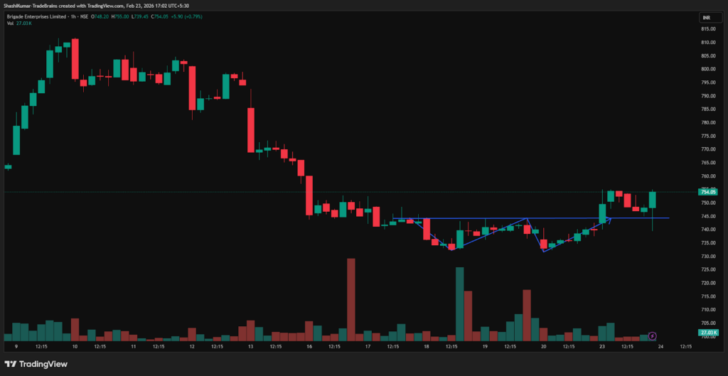 Synopsis: Brigade Enterprises Limited has formed a double-bottom pattern on the 1-hour chart, signaling a possible near-term bullish reversal.