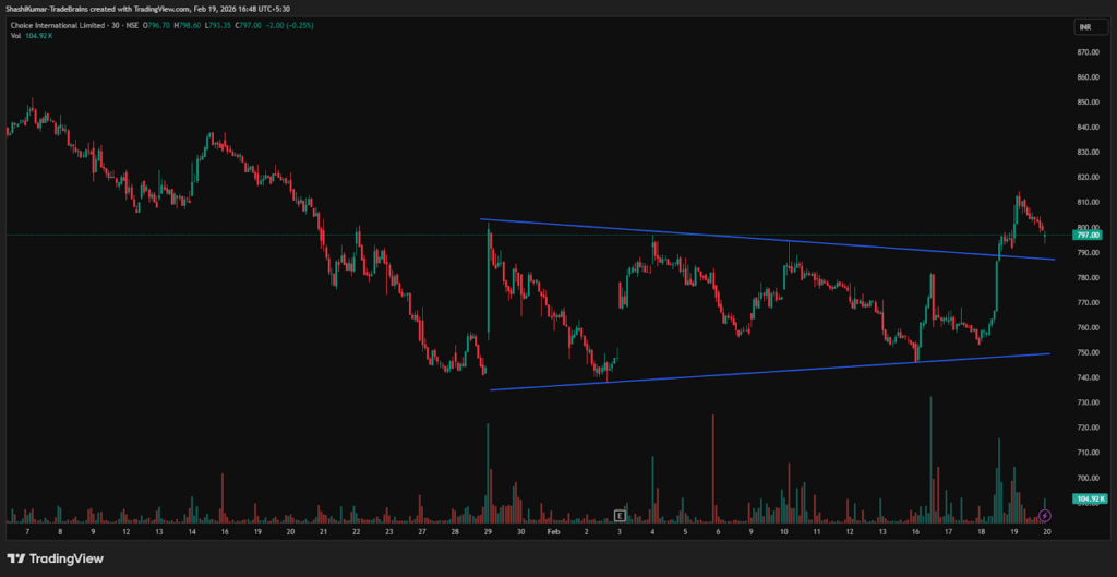 The symmetrical triangle pattern signals potential upside, with holding above Rs 788 on strong volume likely to reinforce near-term bullish momentum.