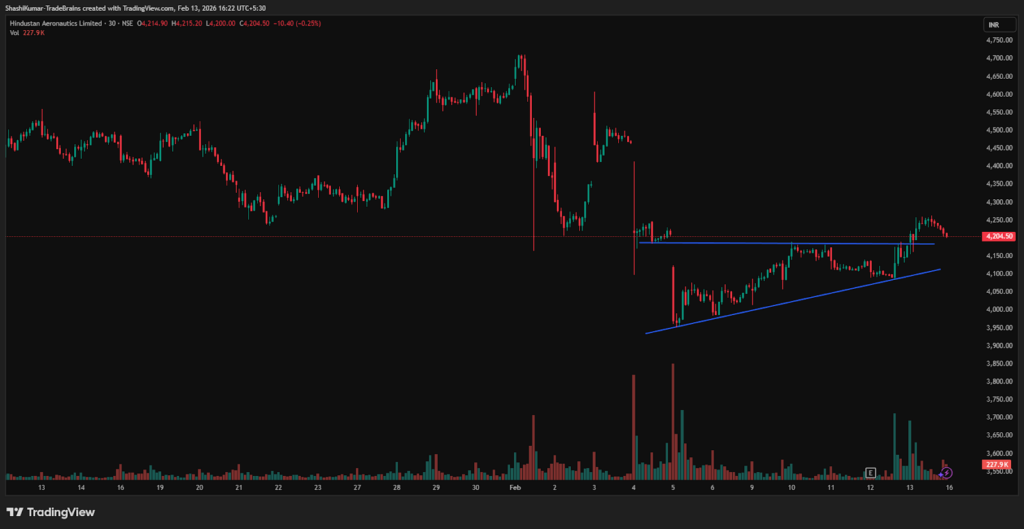 On Friday, Hindustan Aeronautics Ltd broke above the neckline of the ascending triangle on the 30-minute chart and sustained trading above the Rs 4,185 level, reinforcing its bullish momentum.
