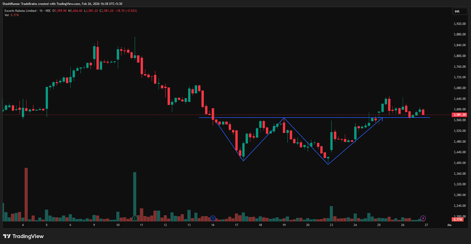 Synopsis: Escorts Kubota Ltd has formed a double-bottom pattern on the 1-hour chart, signalling a potential near-term bullish reversal.