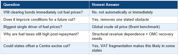 The oil bond repayment does improve things. The ₹9,000–10,000 crore annual interest drag disappears. The government no longer has its go-to justification for keeping excise duties high. OMCs have cleaner balance sheets. India’s fiscal standing with global rating agencies also gets a modest boost.