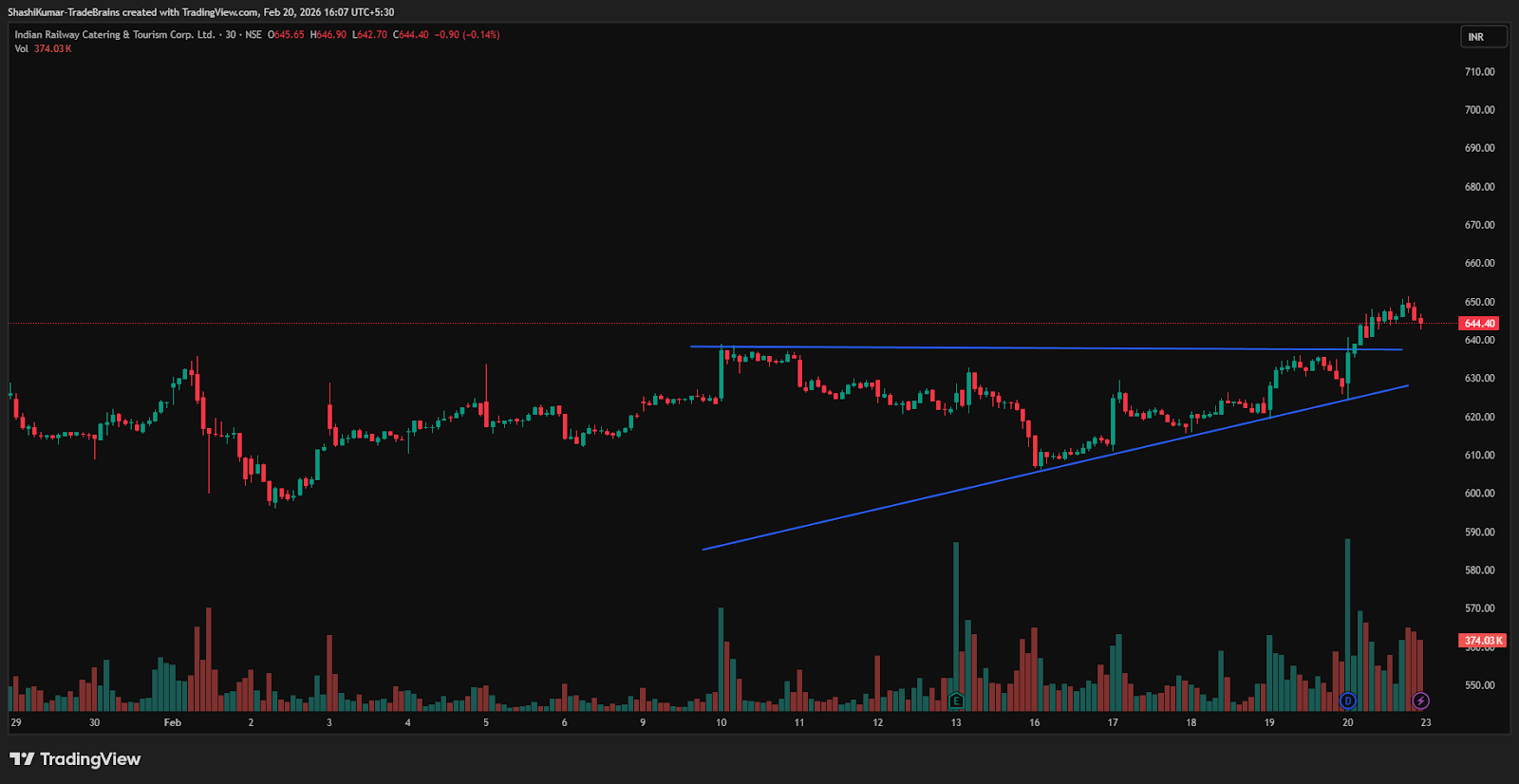On Friday, Indian Railway Catering & Tourism Corporation Ltd moved above the ascending triangle’s neckline on the 30-minute chart and held above the Rs 637 mark, strengthening its bullish momentum.