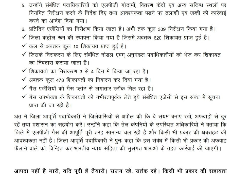 गैस वितरण व्यवस्था को पारदर्शी और सुचारु बनाए रखने के लिए जिले में लगातार निरीक्षण अभियान चलाया जा रहा है। अब तक 309 निरीक्षण किए गए हैं और एजेंसियों के खिलाफ शिकायतों पर प्रतिदिन छापेमारी हो रही है। जिला कंट्रोल रूम में अब तक 620 शिकायतें मिली हैं, जिनमें से 478 का निवारण किया जा चुका है। शेष शिकायतों का समाधान 3 से 4 दिनों के भीतर किया जा रहा है।