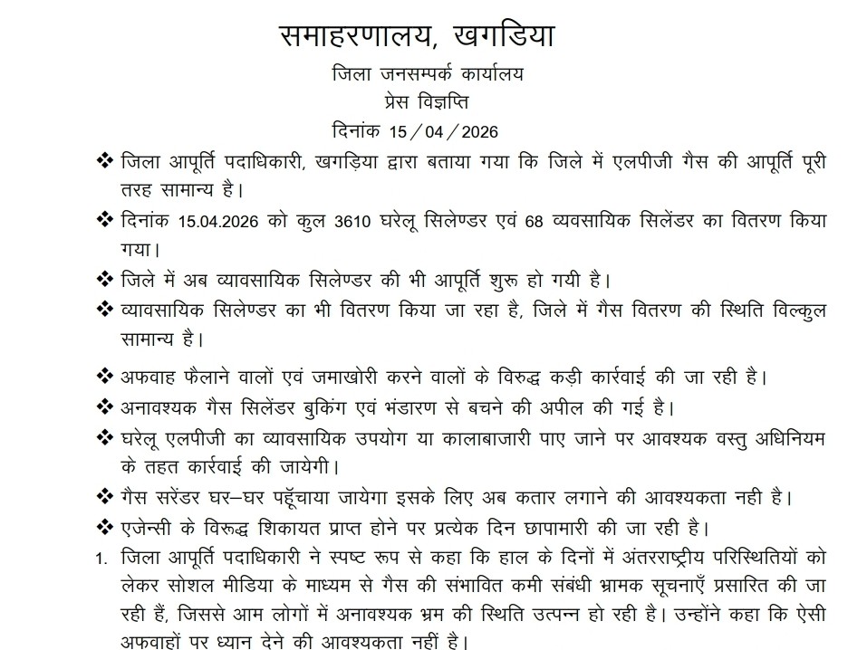 खगड़िया के जिला आपूर्ति पदाधिकारी श्री विजयंत ने स्पष्ट किया है कि खगड़िया जिले में एलपीजी गैस की आपूर्ति पूरी तरह सामान्य है और किसी भी प्रकार की कमी नहीं है। उन्होंने बताया कि 15 अप्रैल को 3610 घरेलू और 68 व्यावसायिक गैस सिलेंडरों का वितरण किया गया