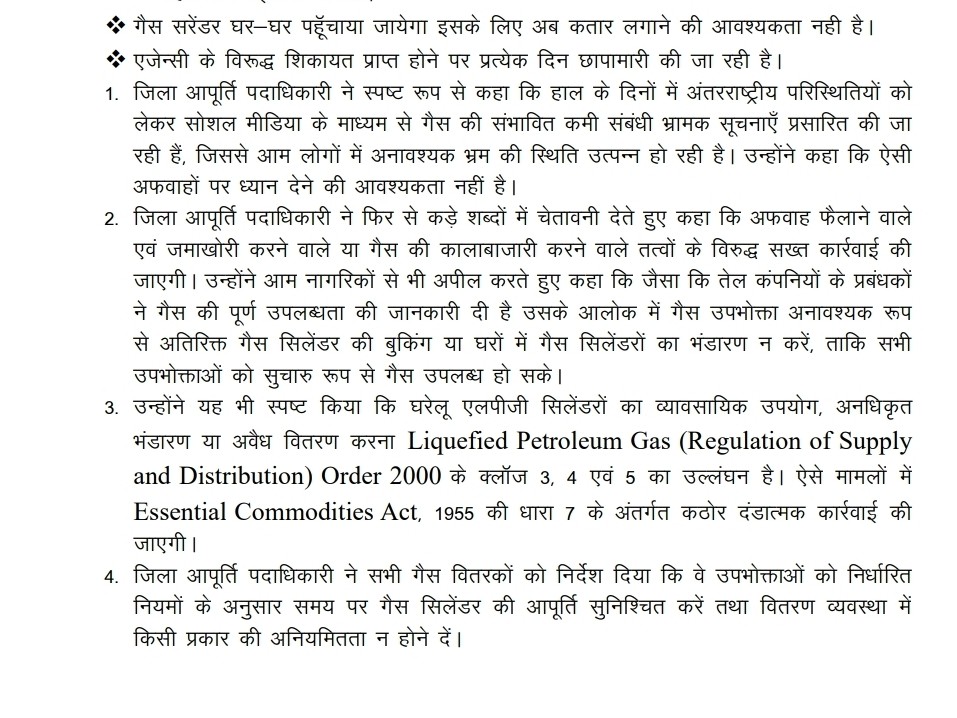 जिला आपूर्ति पदाधिकारी श्री विजयंत ने सभी गैस वितरकों को निर्देश दिया है कि वे निर्धारित समय पर उपभोक्ताओं तक गैस की आपूर्ति सुनिश्चित करें और किसी भी अनियमितता से बचें। संबंधित अधिकारियों को गोदामों और वितरण केंद्रों का नियमित निरीक्षण करने के भी निर्देश दिए गए हैं।