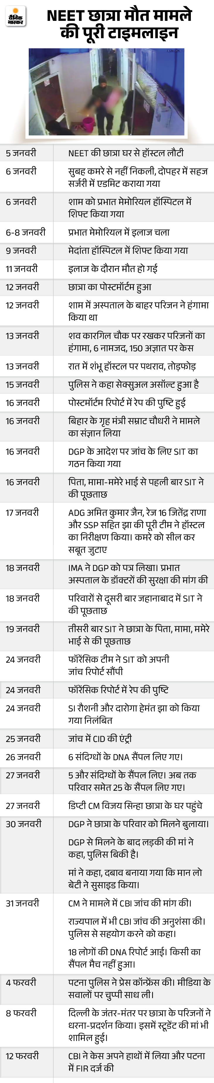 CBI के सामने परिवार ने प्रभात मेमोरियल हॉस्पिटल में छात्रा के किए गए इलाज पर सवाल खड़ा किया। हॉस्पिटल एडमिनिस्ट्रेशन पर इलाज में लापरवाही बरतने और इस मामले के संदिग्धों को फायदा पहुंचाने का आरोप लगाया।