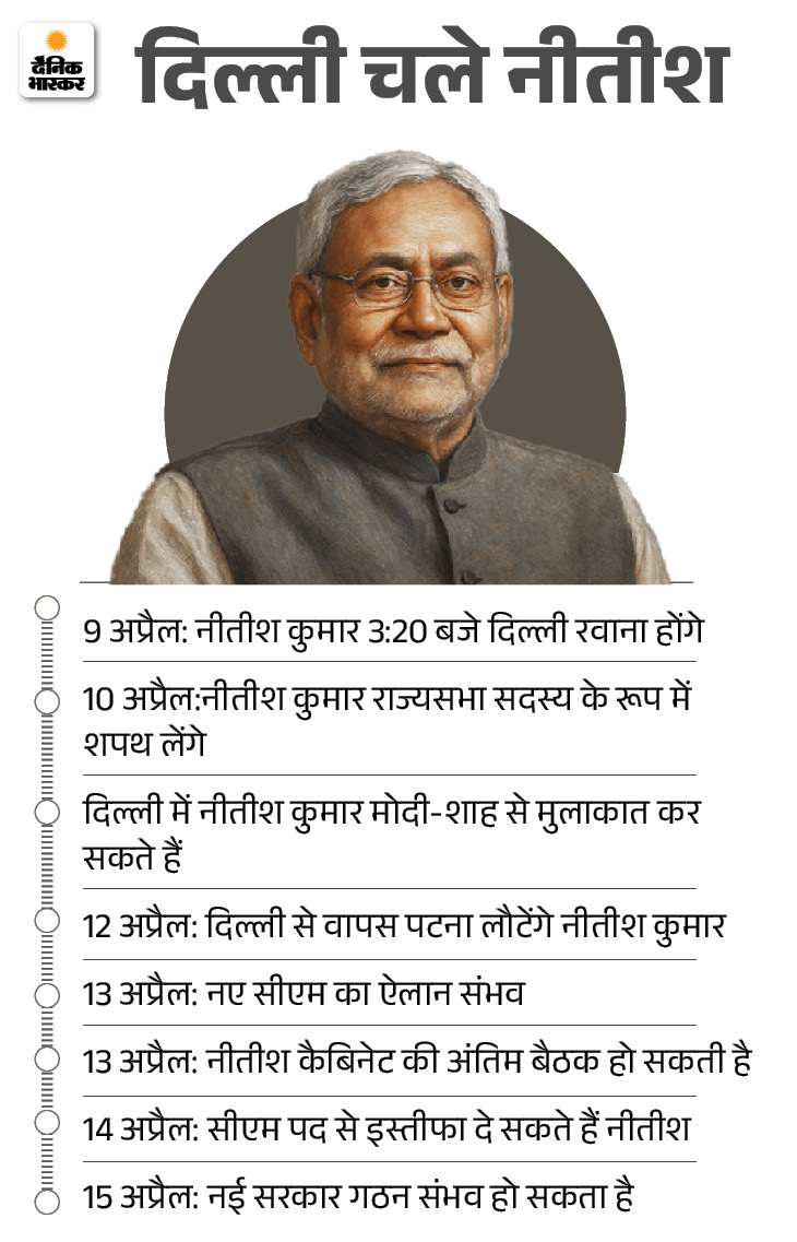 जदयू सूत्रों के अनुसार, सीएम नीतीश कुमार 9 अप्रैल को दिल्ली में अपने दल के नेताओं के साथ मीटिंग करेंगे। बैठक में राष्ट्रीय परिषद और राष्ट्रीय कार्यकारिणी के नेता शामिल होंगे। बिहार की नई सरकार और निशांत कुमार को दायित्व सौंपने पर विमर्श किया जाएगा।