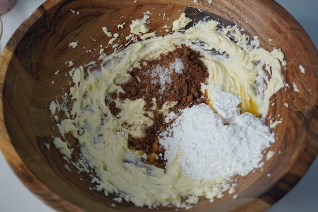 10)Now add in icing sugar, cocoa powder, salt, vanilla extract and whip again until creamy and smooth.