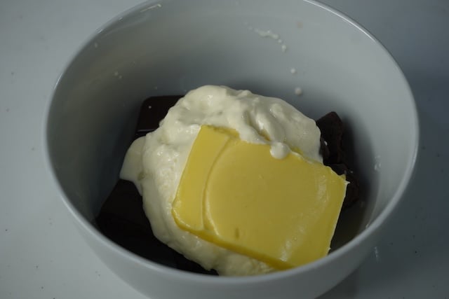 17)next day, Take chocolate, cream and butter in a microwave safe bowl and melt for 10 to 20 seconds.