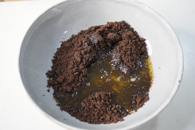 6)Take the cookie crumbs in a bowl, pour melted butter over it and mix well.