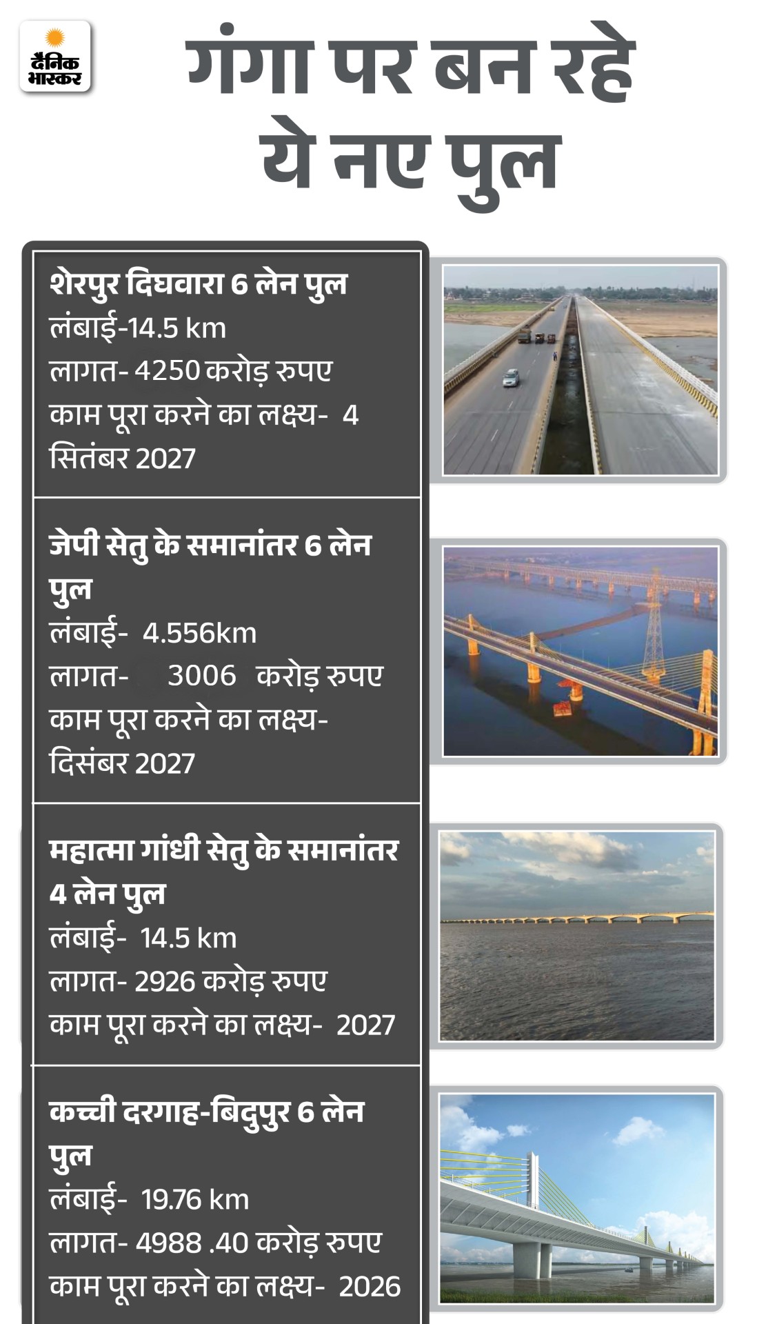 2027 तक बिहार में गंगा नदी पर 23913 करोड़ रुपए से अधिक खर्च कर 8 नए पुल बन जाएंगे। इनपर कुल मिलाकर 38 लेन होंगे। औसतन गंगा पर करीब हर 30 km पर एक पुल होगा। इससे उत्तर बिहार और दक्षिण बिहार के बीच कनेक्टिविटी बेहतर होगी।