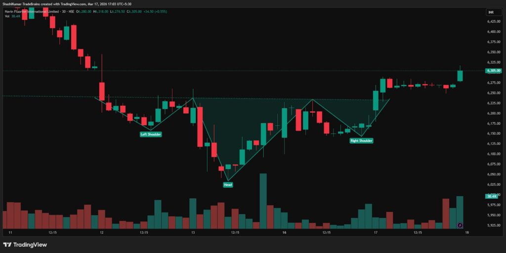 Synopsis: Navin Fluorine International Ltd has formed an Inverted Head & Shoulders pattern on the 30-min chart, suggesting a potential near-term bullish reversal