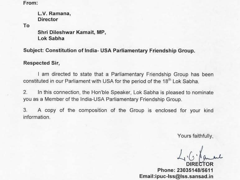 इस संबंध में लोकसभा सचिवालय की ओर से जारी पत्र में बताया गया है कि संसद में अमेरिका के साथ संसदीय मैत्री समूह (Parliamentary Friendship Group) का गठन किया गया है। पत्र के अनुसार, लोकसभा अध्यक्ष की ओर से सांसद दिलेश्वर कामैत को भारत-अमेरिका संसदीय मैत्री संघ का सदस्य मनोनीत किया गया है।