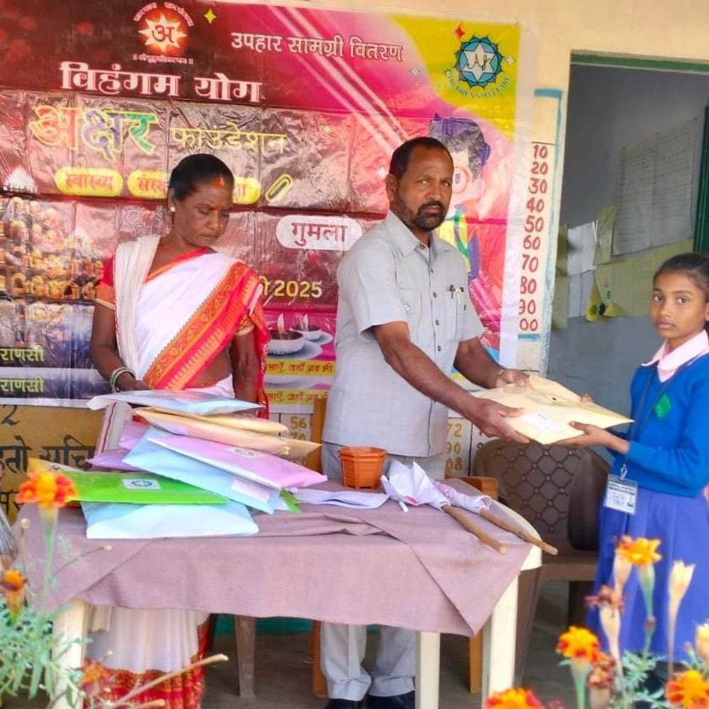 उन्होंने कहा कि केवल किताबी ज्ञान पर्याप्त नहीं है, बल्कि जीवन में संस्कारयुक्त शिक्षा का होना अनिवार्य है। उन्होंने बच्चों को अनुशासित रहकर बेहतर भविष्य गढ़ने के लिए प्रेरित किया। पर्यावरण संरक्षण की दिशा में एक अनूठी पहल करते हुए संस्थान द्वारा बच्चों के बीच छोटे-छोटे गमले बांटे गए। बच्चों को न केवल गमले दिए गए, बल्कि उनमें बीज रोपण करवाकर उन्हें पौधों की देखभाल करने की शपथ भी दिलाई गई। शिवदेव लोहरा ने बच्चों को समझाते हुए कहा कि वृक्ष हमारे जीवन का आधार हैं और प्रत्येक छात्र को कम से कम एक पौधा लगाकर उसकी रक्षा करनी चाहिए। इस सेवा कार्य के अवसर पर समाज के कई गणमान्य लोग उपस्थित रहे। मुख्य रूप से सुखदेव लोहरा, प्रहलाद लोहरा, सोहदतार देवी, इंद्राणी कुमारी, त्रिलोक तिर्की शामिल थे। विद्यालय के प्रधानाध्यापक शिवनारायण महतो ने इस पहल की सराहना करते हुए अक्षर फाउंडेशन और विहंगम योग संत समाज का आभार व्यक्त किया। उन्होंने कहा कि इस तरह के कार्यक्रमों से ग्रामीण क्षेत्र के बच्चों का मनोबल बढ़ता है और उनमें प्रकृति के प्रति प्रेम जागृत होता है।