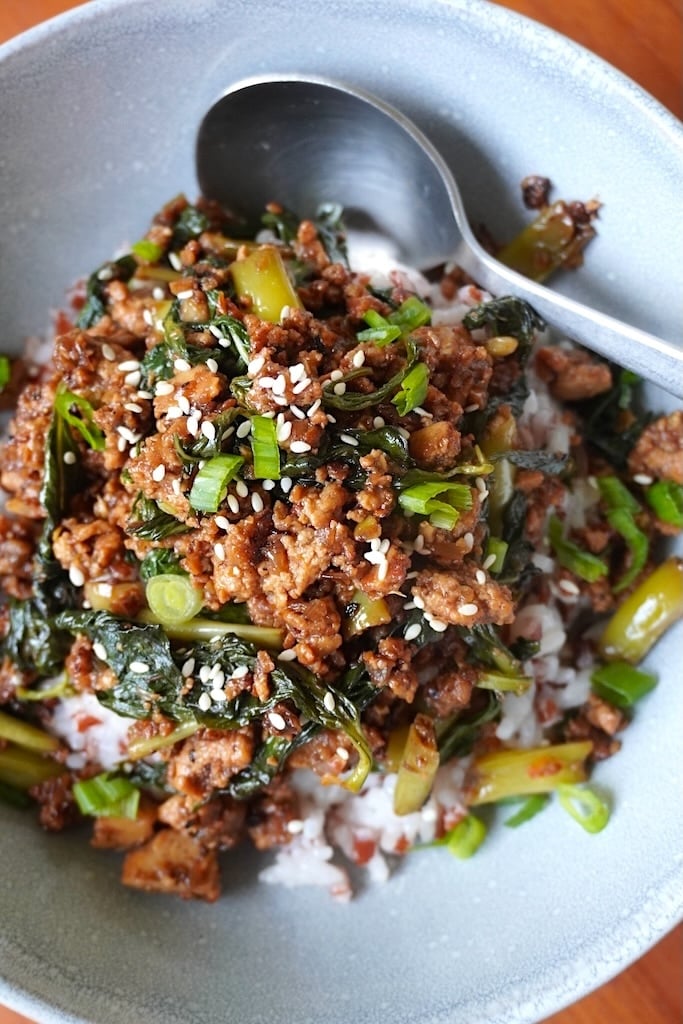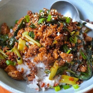 Tofu – choose the right tofu for this dish. Soft or silken tofu won’t work in this recipe, instead use firm or extra firm tofu. Make sure to press the tofu in multiple layers of paper towel to remove excess moisture. Make sure to crumble tofu into fine crumbs so it mix better in the sauces.