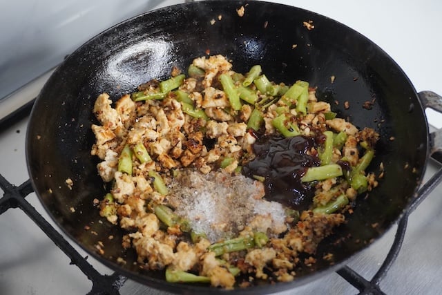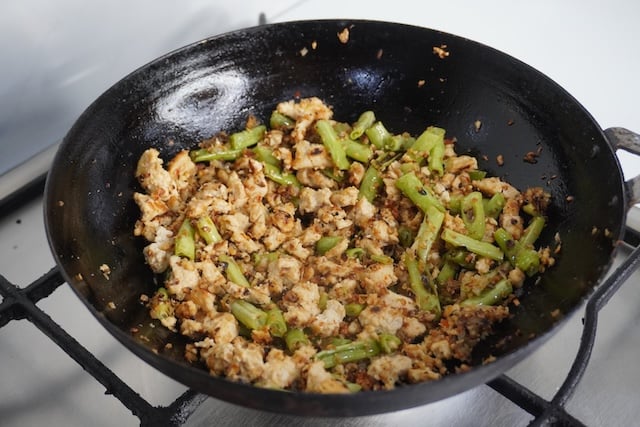 4)Add in crumbled tofu and toss with the garlic mixture on high heat for 2 minutes.