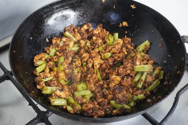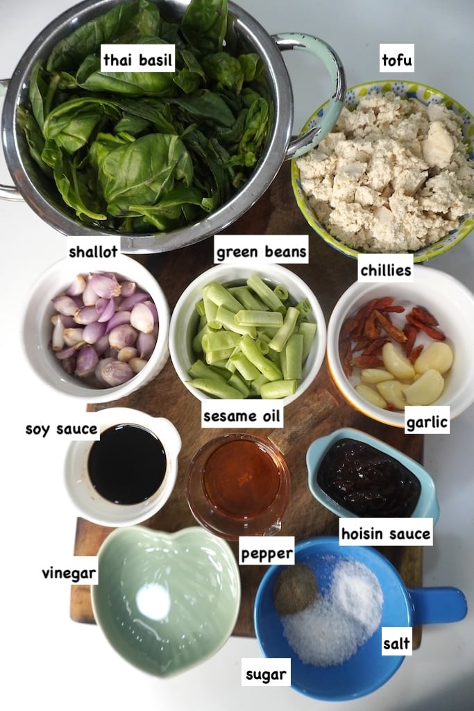 The recipe start by chopping garlic, shallots, bird eye chillies and stir frying in oil. Crumbled tofu is added into the garlic along with sauces, seasonings and finished with Thai basil. The dish is flavour packed and tasted so good with steamed rice.