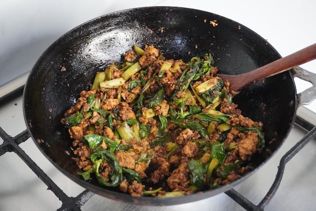 Vegan pad kra pow loosely translates to tofu basil stir fry is a vegetarian Thai dish made by stir frying garlic, onions, red chillies with sauces, seasoning and finished with basil leaves in the end. It is a vegetarian twist to the world famous Thai basil chicken stir fry.