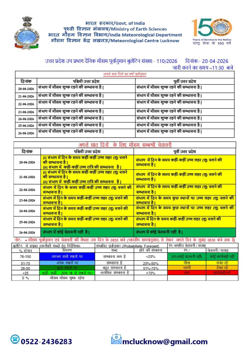 रिपोर्ट में बताया गया, 20 अप्रैल को प्रयागराज में अधिकतम तापमान 44.4 डिग्री सेल्सियस दर्ज किया गया, जो अन्य जिलों के मुकाबले सबसे अधिक था. इसके अलावा, वाराणसी में अधिकतम तापमान 44 डिग्री, सुलतानपुर में 43.3 डिग्री और बांदा में 43 डिग्री सेल्सियस दर्ज किया गया. यूपी की राजधानी लखनऊ में अधिकतम तापमान सामान्य से 3.1 डिग्री अधिक 41.6 डिग्री सेल्सियस दर्ज किया गया. वहीं, न्यूनतम तापमान सामान्य से 2.4 डिग्री अधिक 24.0 डिग्री सेल्सियस रहा.