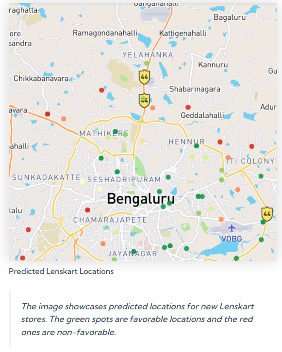 The model is trained on existing store data and tested on separate datasets across different cities, not just Tier 1 or metro markets, to reduce bias and improve accuracy. This allows Lenskart to forecast how much revenue a new store could generate in the coming months. By choosing locations more carefully, the company can maximize revenue at the store level, reduce missed opportunities, and limit the risk of new stores affecting sales of nearby outlets. In the end, every potential site is given a score, where a higher score signals stronger expected performance.